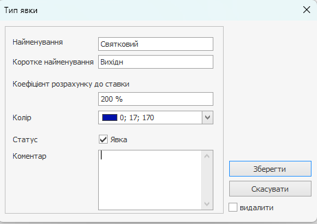 Якщо тип явки повинен позначати невідпрацьований час (наприклад, відпустка, лікарняний, відрядження, прогул), то повинен бути заданий коефіцієнт розрахунку до ставки (наприклад, «0 %» для прогулу, «80%» для лікарняного тощо) і видалено галочку в полі Статус (його значення зміниться на «Неявка»).
