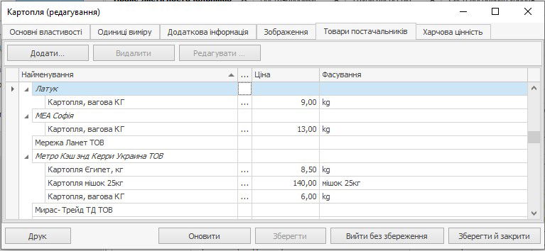 Спочатку у цій вкладці представлений список постачальників, зареєстрованих на даний момент у системі. Щоб задати, як цей товар (або напівфабрикат) проходять за документами певного постачальника, виконайте наступні дії:
