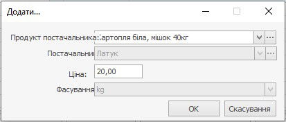 - У вікні задайте назву товару у даного постачальника. Якщо у списку поля Продукт постачальника ця назва відсутня, то додайте його. Для цього натисніть кнопку.