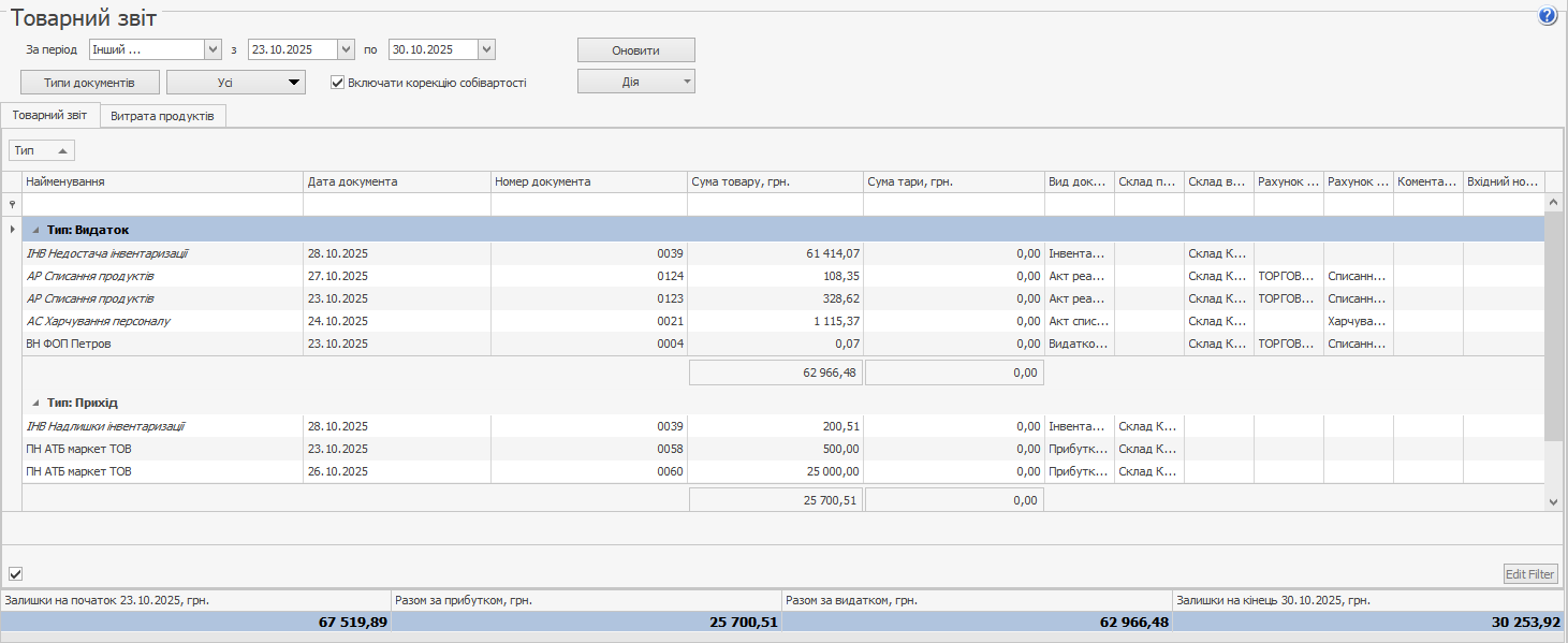 Товарний звіт надає інформацію про всі документи, відповідно до яких було зареєстровано рух товарів на складах закладу.