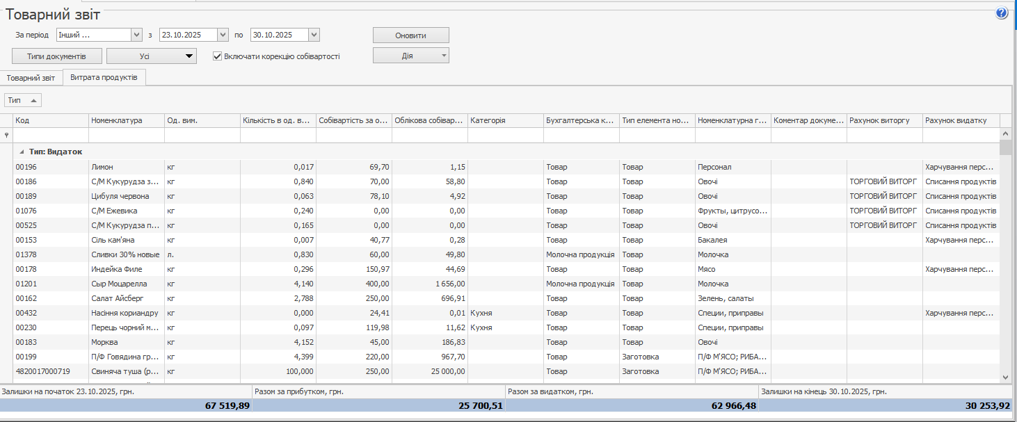 На вкладці Витрата продуктів представлена інформація про всі елементи номенклатури, за якими зареєстровані витрати та надходження за вказаний період на обраних складах. Для кожної номенклатурної позиції відображається її кількість та собівартість на початок і кінець обраного періоду.