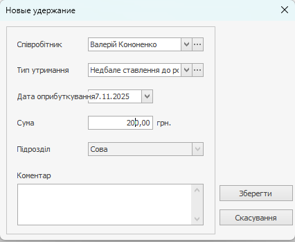 Введіть коментар, що пояснює причину утримання, і натисніть кнопку Зберегти.