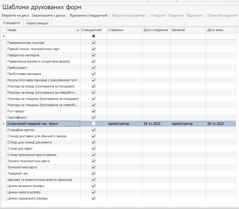 - Перейдіть на вкладку Стандартні, виділіть шаблон, який потрібно замінити новим, і натисніть кнопку Завантажити з диска. У стовпці Стандартний зникне галочка, і буде зафіксовано, хто і коли створив та змінив шаблон.