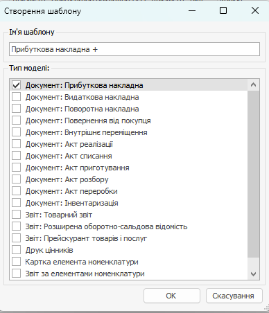- Введіть Ім'я шаблону, виберіть Тип моделі та збережіть зміни. Тип моделі — це набір властивостей і даних, які будуть використовуватися в шаблоні. Наприклад, для користувацького шаблону прибуткового ордера потрібно вибрати тип моделі «Прибуткова накладна», оскільки ордер містить реквізити та дані з прибуткової накладної. Можна вказати кілька типів моделей — для деяких звітів можуть знадобитися дані видаткової та прибуткової накладних.