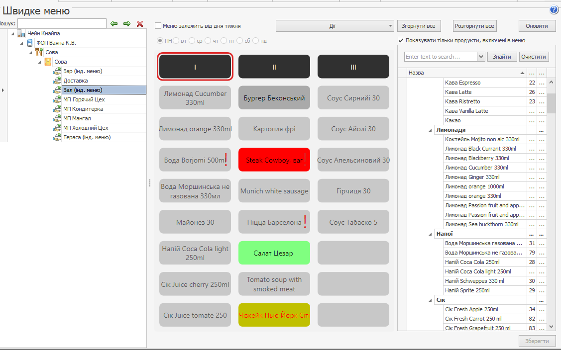 означає, що швидке меню для відділення не створено або в ньому немає страв. У цьому відділенні діятиме меню, налаштоване для всієї групи. - Три закладки швидкого меню. Кожна закладка має назву і містить 24 комірки. У комірку меню можна додати тільки одну страву або номенклатурну групу.