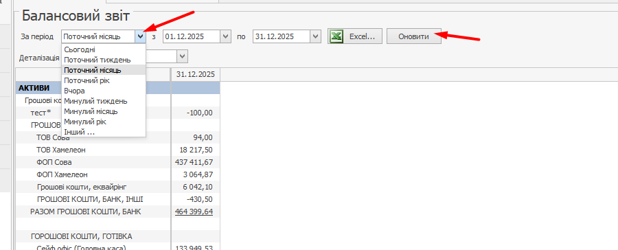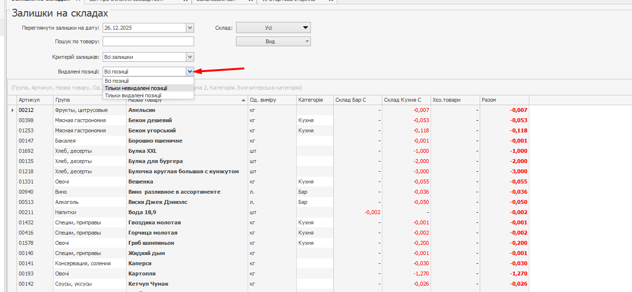 У деяких звітах фільтри знаходяться над табличною частиною. Щоб відфільтрувати дані, достатньо вибрати значення у полях звіту та натиснути Оновити. Наприклад, у звіті Залишки на складах таки фільтри — Критерій залишків та Видалені позиції.