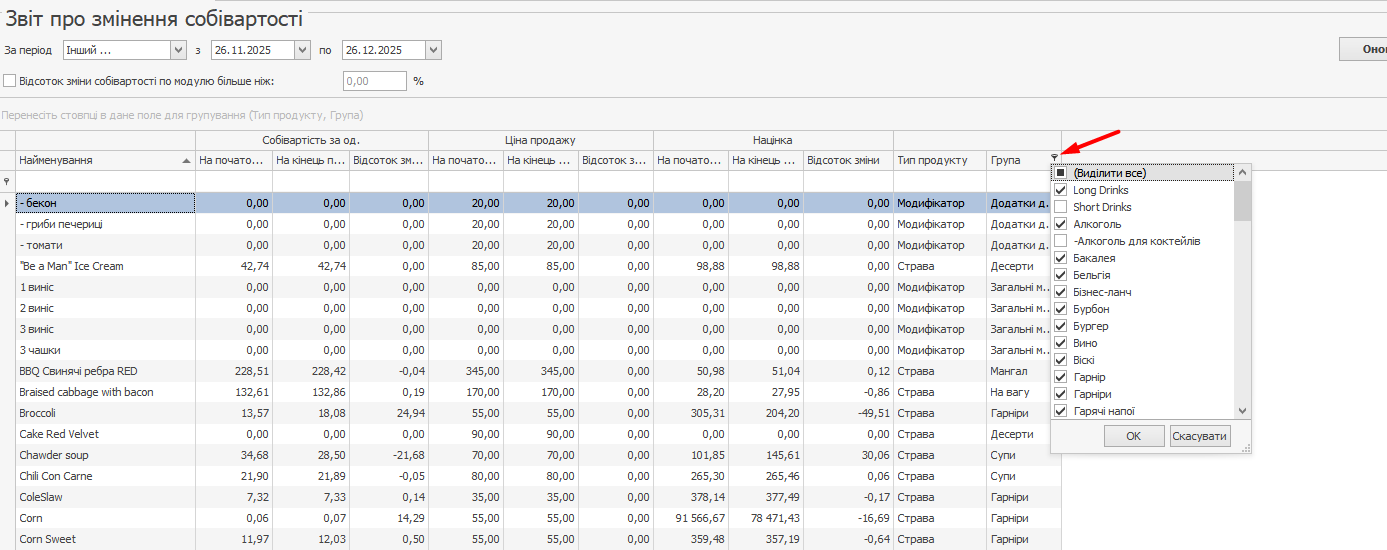 Приклад простого фільтра у Звіті про зміну собівартості: Група. Тут є можливість вибрати всі запропоновані варіанти або відзначити вибірково.