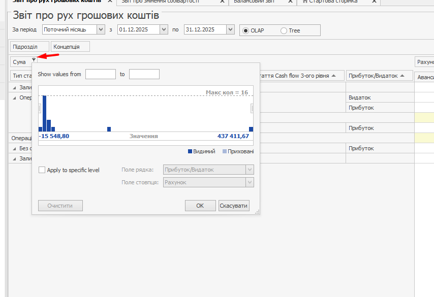 Приклади складніших фільтрів у Звіті про рух коштів: Підрозділ, Концепція, Прихід/Витрата та ін.