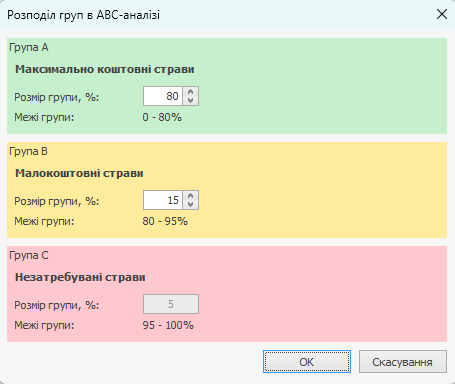 Щоб дізнатися, скільки страв входить до кожної групи ААА або ССС, у меню Налаштування виберіть пункт Розподіл за групами (ABC).
