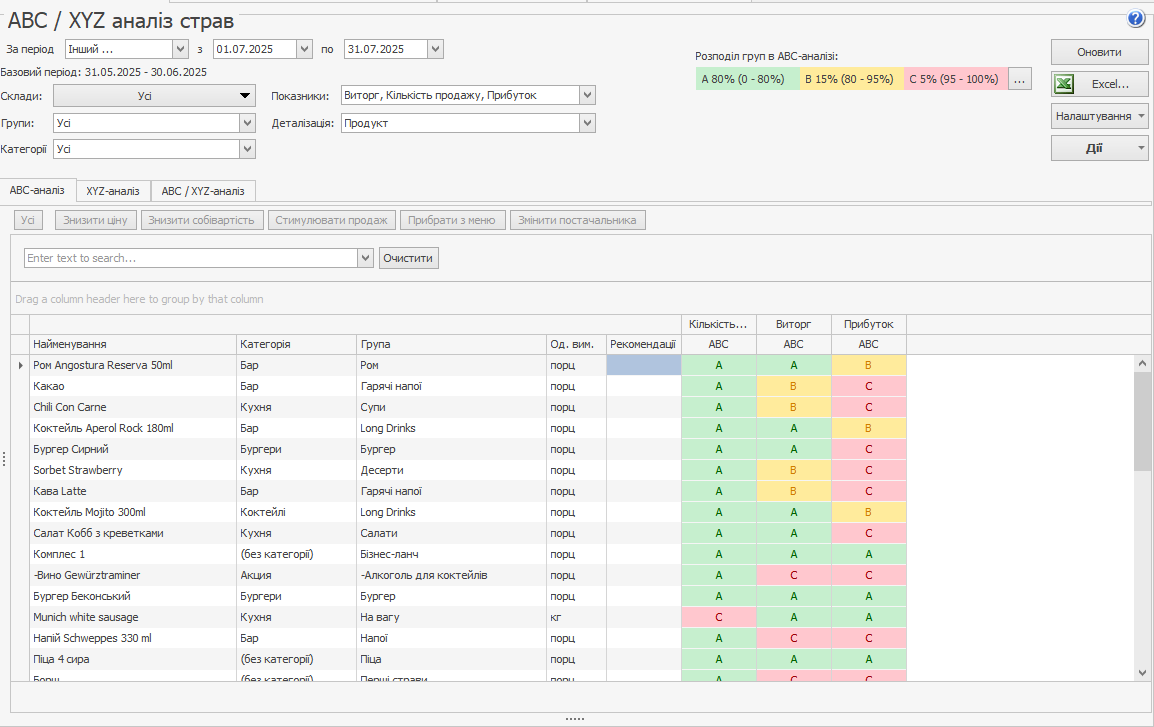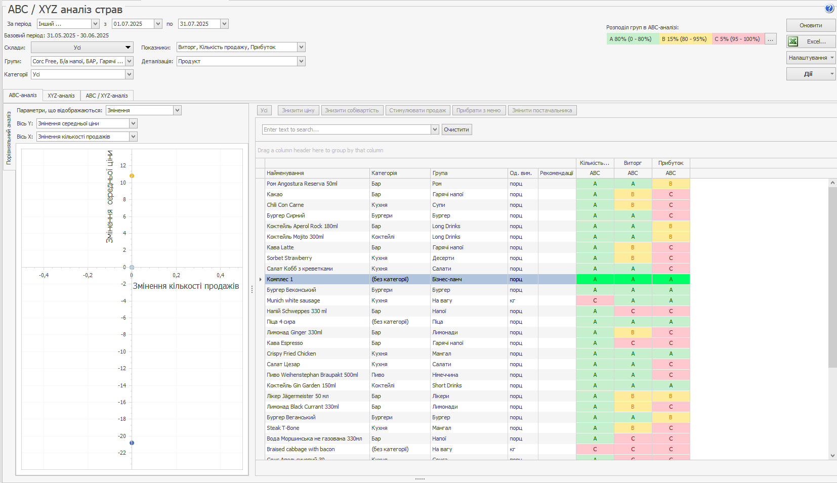 У матриці по вертикалі розташовані групи ABC-аналізу, по горизонталі — XYZ-аналізу. На їх перетині в комірці вказано кількість продуктів, віднесених до цих груп. Щоб переглянути список страв, що входять до комірки, двічі клацніть лівою кнопкою миші по ній.
