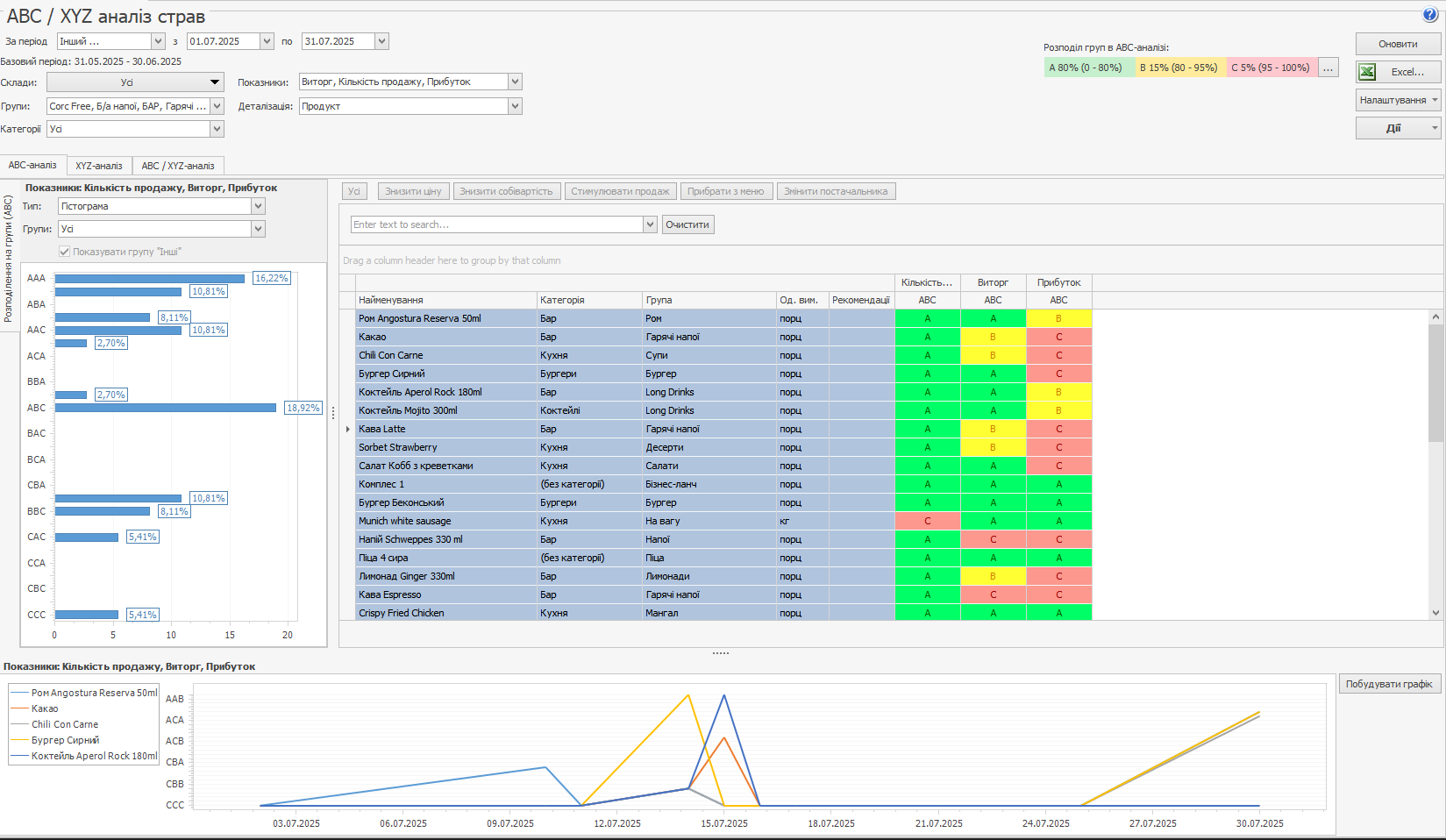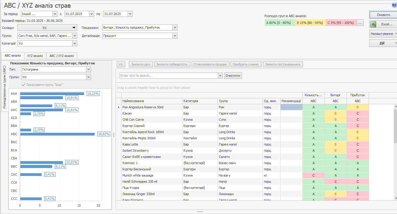 ABC-аналіз страв — це ранжування позицій меню, що продаються, за ступенем важливості на основі трьох груп. Найчастіше це кількість продажів, оборот і прибуток.