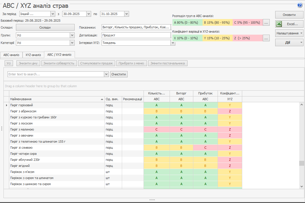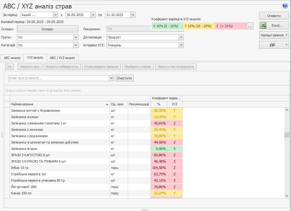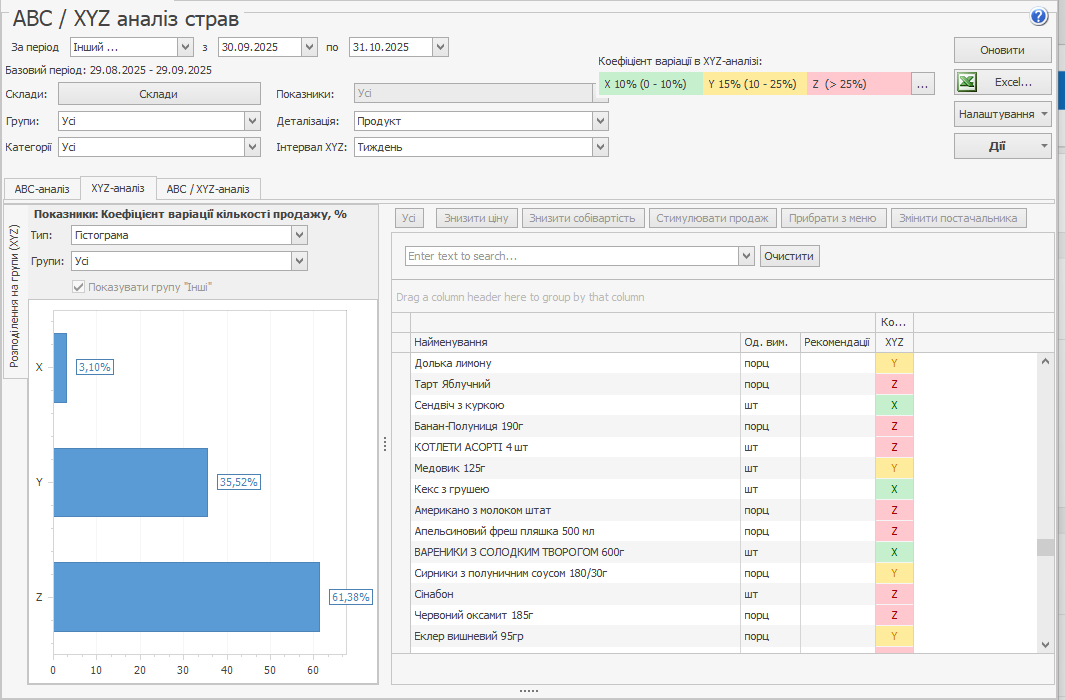 Сформується таблиця, де страви (групи або категорії) розподілені по групах XYZ. Щоб відобразити значення розрахованих коефіцієнтів варіації, в меню Налаштування встановіть галочку Показувати значення.