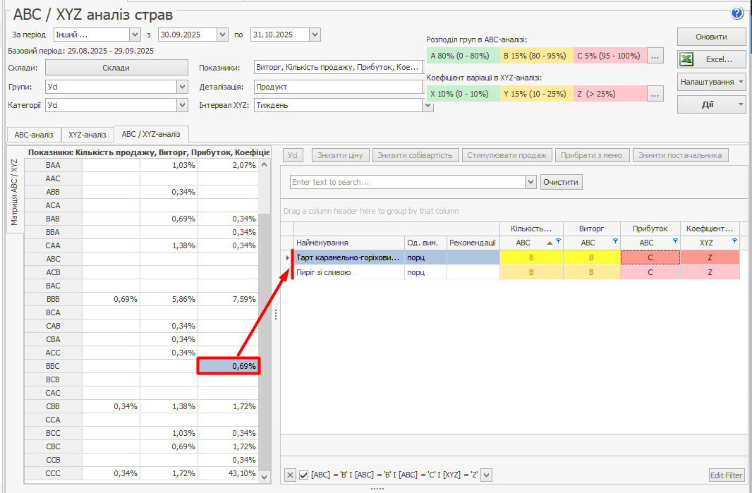 При комбінованому аналізі також формується категорійна матриця. Щоб її відкрити, в меню Налаштування виберіть пункт Матриця ABC/XYZ.