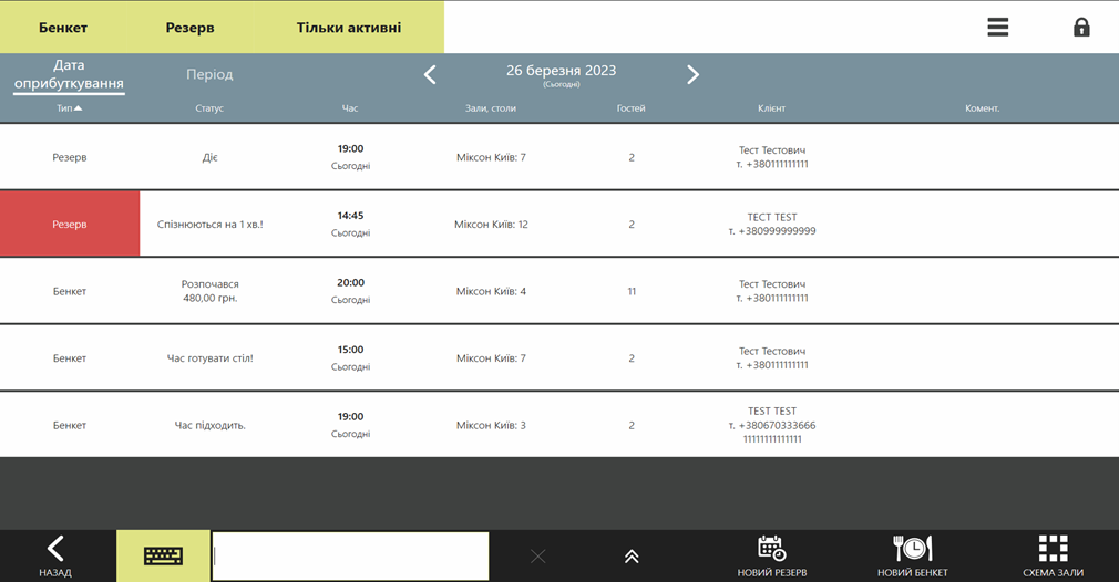 Список БР відкривається при натисканні кнопки Бенкети та резерви на екрані додаткового меню або кнопки Бенкети/резерви на схемі залу. У ньому відображаються всі бенкети та резерви на сьогодні або на будь-яку іншу дату, яку можна вибрати в календарі або за допомогою кнопок