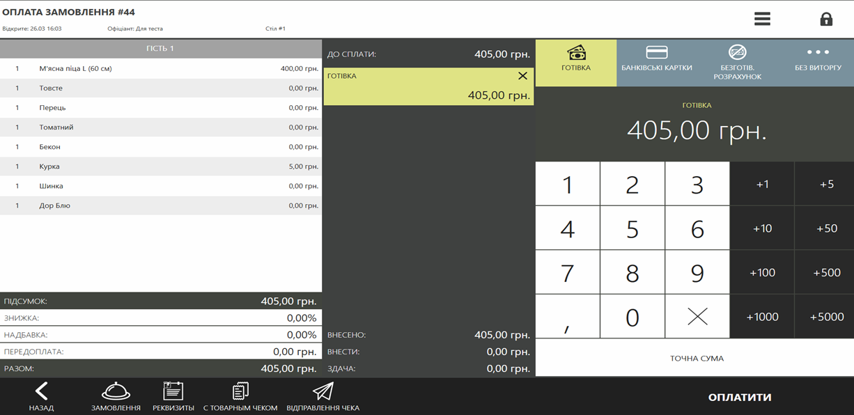 Праворуч – кнопки вибору способу оплати замовлення та кнопки введення суми оплати. Для вибору способу оплати замовлення натисніть відповідну кнопку – «Готівка», «Банківські картки», «Без виручки» або «Безготівковий розрахунок».