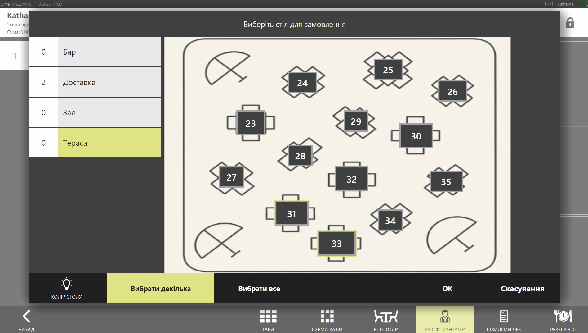 В рамках одного залу під час відкриття замовлення ви можете вибрати кілька столів. Для цього: