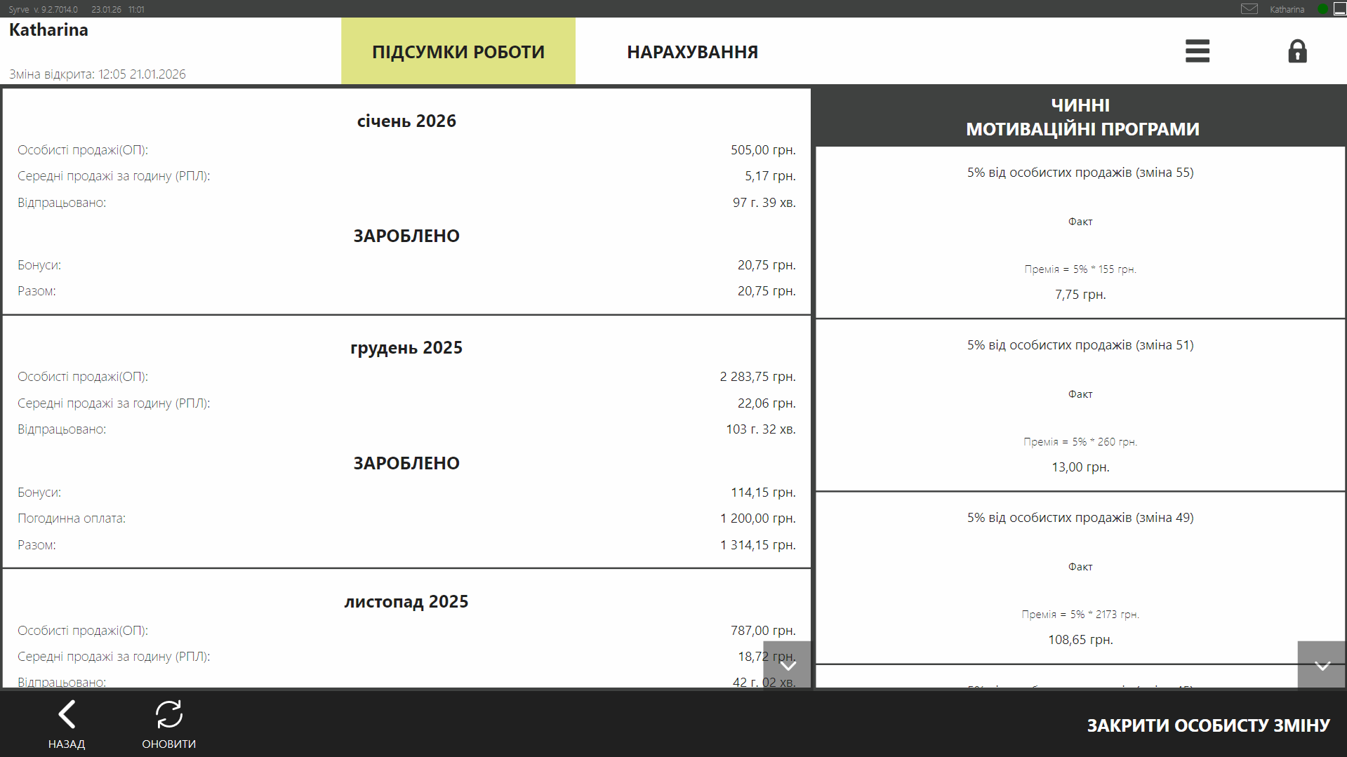 У процесі роботи співробітник може перейти особисту сторінку. Тут він може дізнатися, скільки заробив за останній місяць, а також переглянути свої повідомлення новин. З особистої сторінки можна відкрити особисту зміну.