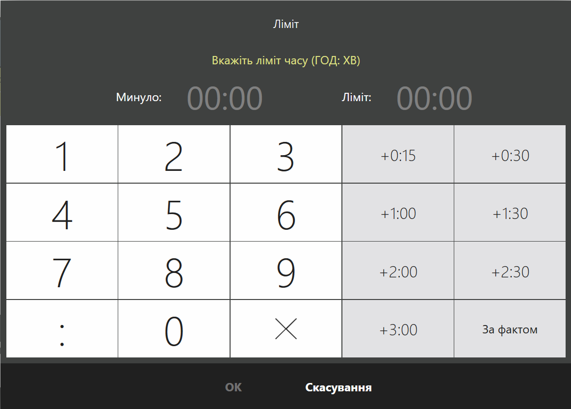 Можна продавати час блоками, для цього призначено кнопку Ліміт у вікні замовлення. Коли встановлено ліміт часу, послуга буде автоматично зупинена. Послугу можна зупинити вручну, натиснувши кнопку Попередній чек або Стоп, при цьому замовлений час оплачується повністю.