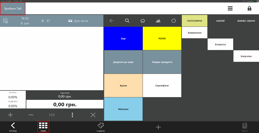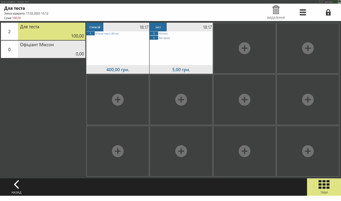 Працівник може працювати як зі своїми замовленнями та табами, так і замовленнями та табами відкритими іншими співробітниками.